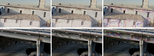 Inoltre, il sistema è stato integrato in una piattaforma di analisi per l’elaborazione automatica di video acquisiti da droni. La piattaforma consente di tracciare l’evoluzione dei danni nelle sequenze video e di generare automaticamente report sintetici, agevolando il lavoro degli esperti e accelerando le operazioni di emergenza.